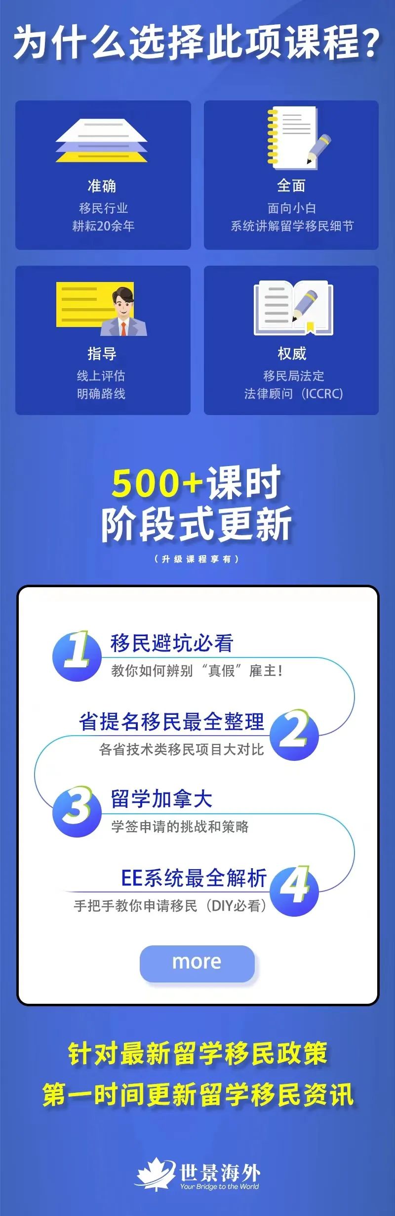 扫码即刻抢购! 28节避坑雷达课程 一次付费永久学习 课程由世景团队录制而成,浓缩了世景sir近20年加拿大移民留学咨询服务的经验,教你辨别真假雇主,以及各省提名移民项目的详解,以及与加拿大移民留学相关的一切咨询、信息。