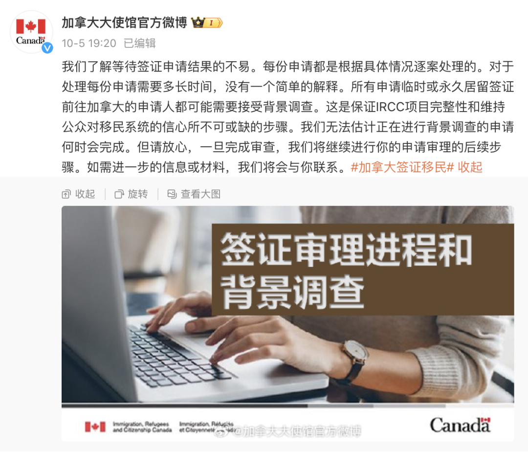 在10月6日,加拿大大使馆官方微博发文称,现在他们无法对每份申请需要等待多长时间给出一个简单明确的数字。 现在所有申请临时或永久居留签证前往加拿大的申请人,可能都需要接受背景调查!