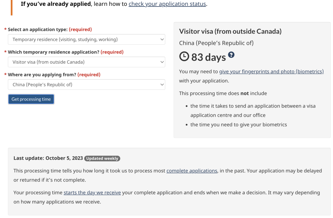 翻译过来就是,现在加拿大开始对签证申请进行严格背调,调查要多长时间根本没个准话! 等待过PR申请的应该都知道,申请一旦陷入长时间背调,那等待时间可就真的很难说了,短则几个月长则数年,打电话发邮件调档案,都拿移民局一点办法没有。 现在加拿大联邦政府官网,上面显示现在从中国提交加拿大访客签证,等待时间大约为83天: